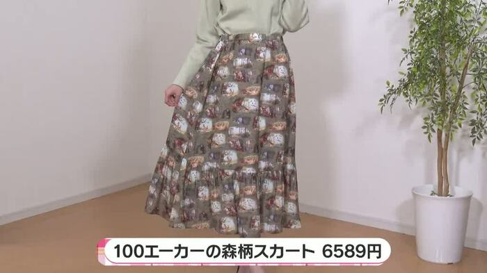 もう1つ人気なのがこちらのスカート!よーく見てみると、プーさんの物語の舞台が描かれています。さらに前と後ろですその切り返しの高さが違うので、きれいな揺れ感が出るこだわりデザインになっているんですよ。