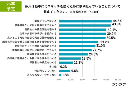 [2.26卒予定]では、ミスマッチ防止の取り組みで「業界について伝える」(44.6%)、「良いところだけではなく大変な部分を伝える」(39.5%)といった本音の情報開示を重視しています。加えて、「職場見学などで働く現場を見てもらう」(43.8%)、「仕事体験できる機会をつくる」(24.6%)など、実践的な体験の場を提供することで、入社後のギャップを減らす工夫がされています。
