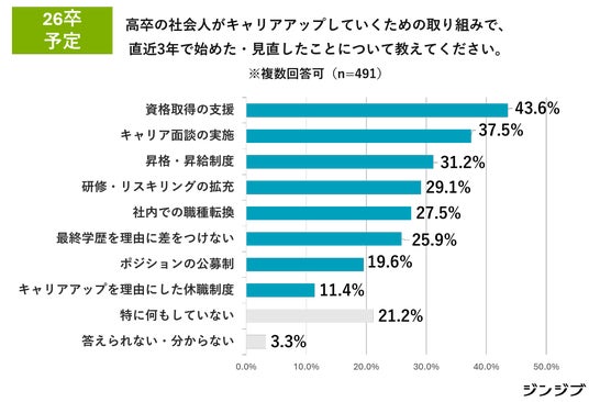 [2.26卒予定]によると、高卒社員のキャリアアップ支援の取り組みでは「資格取得の支援」(43.6%)、「キャリア面談の実施」(37.5%)、「研修・リスキリングの拡充」(29.1%)を重視していることがわかります。また、社会人スタートのフォローでの「社会人の基礎研修の拡充」(31.6%)、「メンター制度/ブラザー制度」(21.6%)という回答からも、手厚い育成・定着支援を具体的に推進しています。