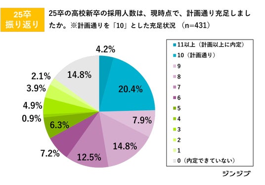 現在の高卒採用は、まさに「売り手市場」が加速しています。厚生労働省のデータ(*1)によると、令和7年3月末の高卒採用の求人倍率は4.10倍となりました。約12.1万人の就職者に対し、約49.9万人の求人があったことを示しており、企業が高校生の新卒人材を強く求めている状況が明らかです。ジンジブが2025年2月に実施した、25卒振り返りアンケート [以下、1.25卒振り返り]では、企業の約7割が採用計画に対して未達と回答がありました。計画通り採用できた企業は24.6%に留まり、60.6%は採用ができたものの採用計画に対して未達、14.8%は採用ができなかったと回答しています。