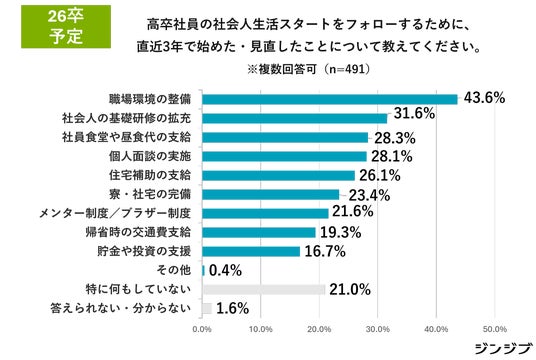[2.26卒予定]では、「社員食堂や昼食代支給」(28.3%)、「住宅補助」(26.1%)、「寮・社宅完備」(23.4%)といった福利厚生を充実させる企業が増えています。