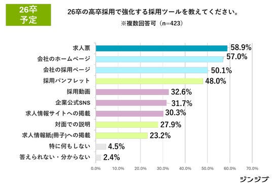これに対応し、[2.26卒予定]では、企業が強化する採用ツールとして「会社のホームページ」(57.0%)以外に、「採用動画」(32.6%)、「企業公式SNS」(31.7%)、「求人サイト」(30.3%)などデジタルを活用したツールが上がりました。
