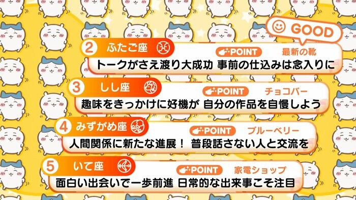 『めざましテレビ』で放送中の「ちいかわ占い」 テレビ放送がない日はお休みで、月~土:朝7時以降に更新予定です。
