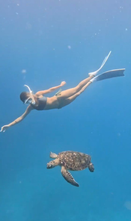 興味津々な様子でウミガメを見つめながら泳ぐみちょぱさんの姿が、なんともほほ笑ましいですね!