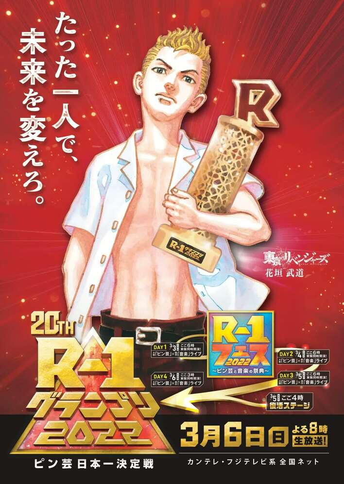 3月6日(日)20時より放送される『R-1グランプリ2022』(カンテレ・フジテレビ系)では、「R-1グランプリ」の優勝トロフィを抱えた花垣武道をメインビジュアルとして使用し、「たった一人で、未来を変えろ。」というキャッチコピーのもと、テレビやSNSなどでの展開を予定。