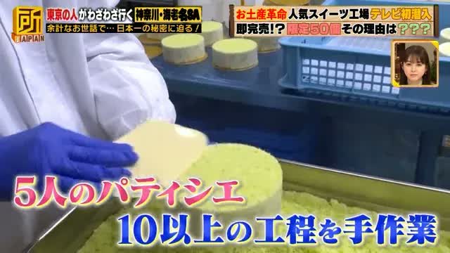 番組が工場へテレビ初潜入すると、大きな機械は見当たらず、なめらかな触感を出すためにチーズケーキの生地を手作業で混ぜるなど、5人のパティシエが10を超える工程を機械に頼らずにおこなっていました。
