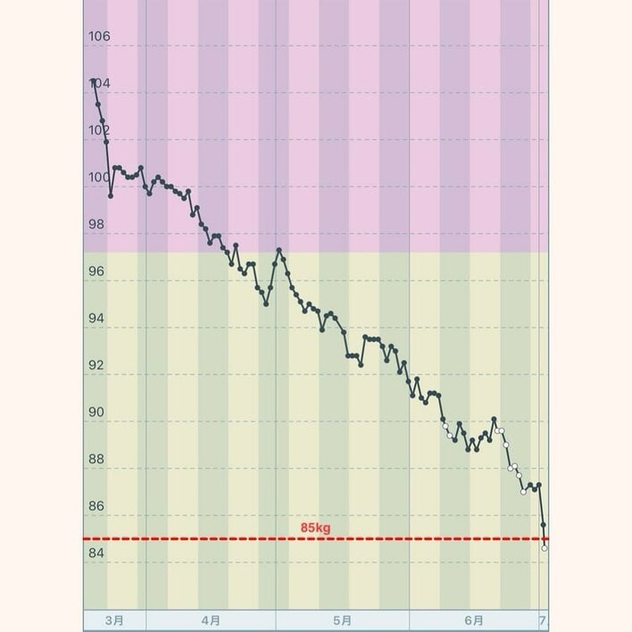公開された体重の推移を記録した線グラフは、3月時点で約105キロありましたが、右肩下がりに減っていき、7月上旬には85キロ以下に。