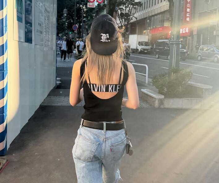 デニムパンツに黒のタックトップを組み合わせた、カジュアルコーデの山本さん。ざっくり開いた背中に、ロングヘアをなびかせながら街中を歩いています。