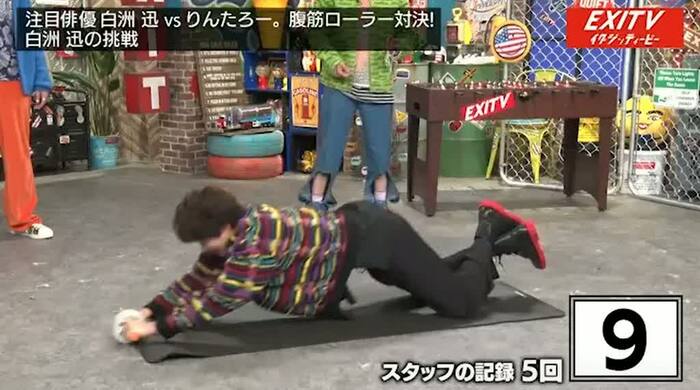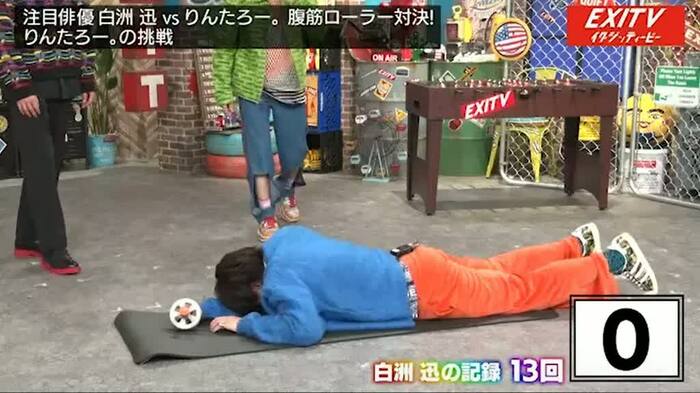 「1回3万円のトレーニングをやっている」と、りんたろー。さんがドヤ顔を見せると、急遽「白洲迅vsりんたろー。 腹筋ローラー対決」が開催されることになりました。