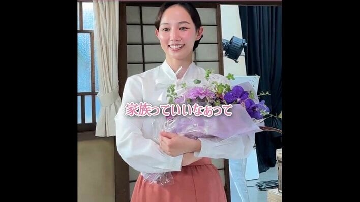 咲妃さんと小川さんは、紫と白を基調とした花束を抱えてニッコリ。両脇に立った芳根さんと森さんも、2人に手を向けて一緒に微笑んでいて、とても華やかな雰囲気の1枚です。