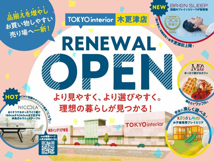 株式会社東京インテリア家具(本部:栃木県鹿沼市、取締役社長:利根川隆弘)は、千葉県木更津市の「東京インテリア家具 木更津店」を2025年7月5日にリニューアルオープンいたしました。今回のリニューアルでは、店舗内のレイアウトや提案コーナーを一新し、より一層“理想の暮らし”を実現できる売り場構成へと進化いたしました。