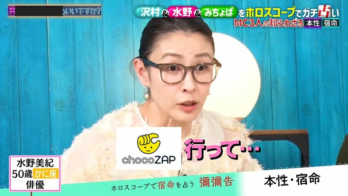 7月6日放送の『突然ですが占ってもいいですか?』は、沢村一樹さん、水野美紀さん、みちょぱこと池田美優さんが、彌彌告(MiMiKO)さんに占われました。