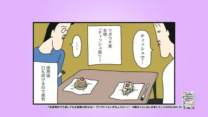 そんなツボウチさんの自宅では、洗い物を減らすために買ってきたケーキは、ティッシュを敷いただけの“ティッシュ皿”で食べているそうです。