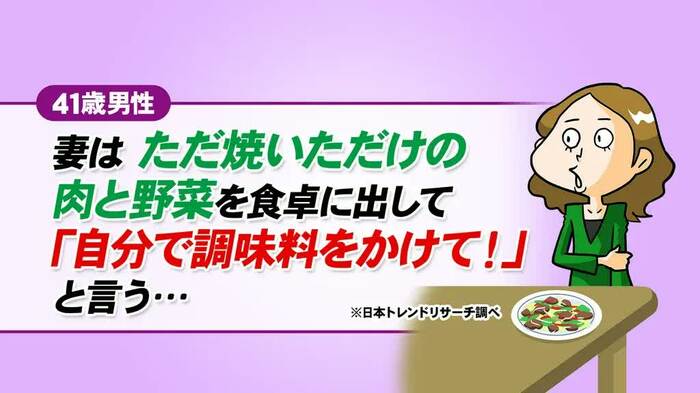 41歳の男性からは、「妻はただ焼いただけの肉と野菜を出して、『自分で調味料をかけて』と言ってくる」というお悩みも到着しました。