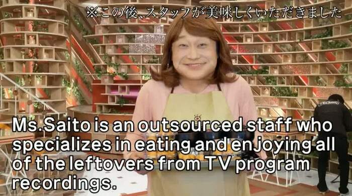 Ms. Saito is an outsourced staff who specializes in eating and enjoying all of the leftovers from TV program recordings.