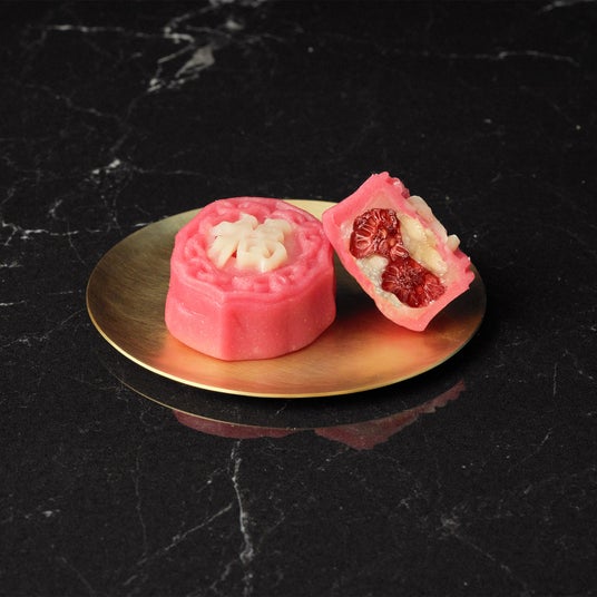 薔薇の花びらを練り込んだ淡いピンクのあんで、柔らかな求肥を包み込んだ、華やかな薔薇の香りを楽しむ、贅沢な味わいのムーンケーキです。