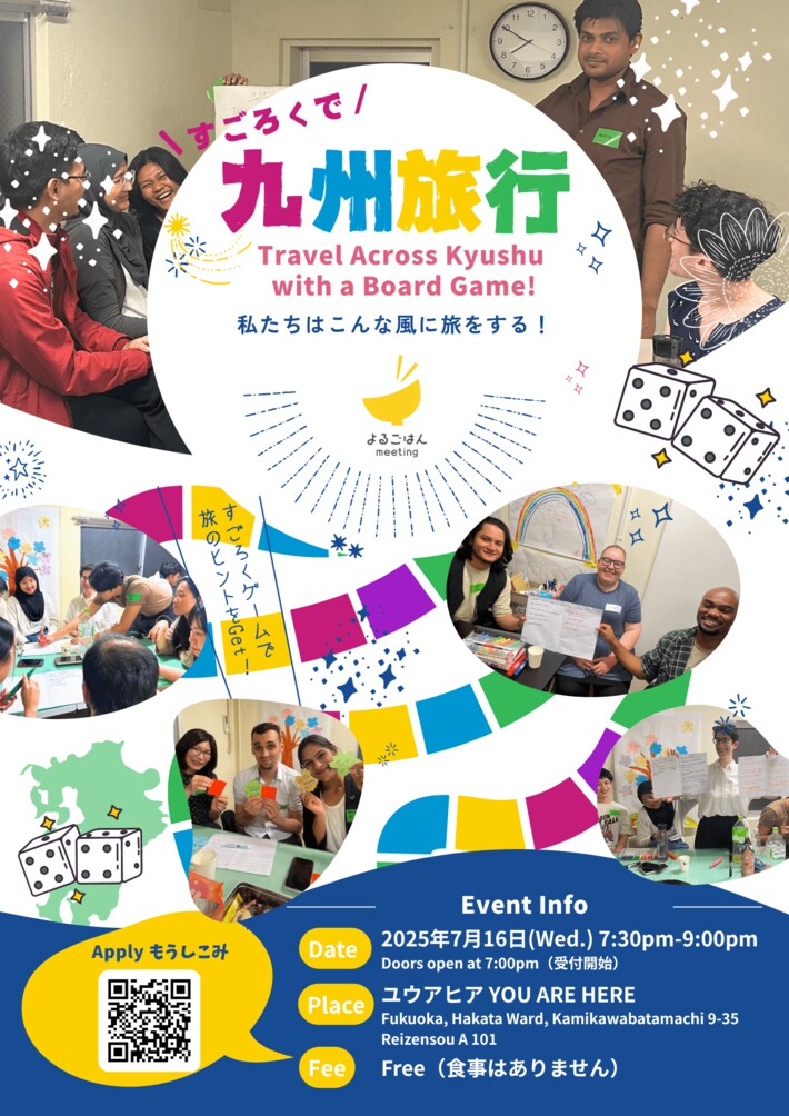 一般社団法人YOU MAKE IT(本社:福岡県福岡市、代表理事:Kenji Umeki)は、2025年7月16日(水)、福岡市博多区のコミュニティスペース「YOU ARE HERE(冷泉荘内)」にて、在留外国人と地域住民が交流する多文化イベント「Travel Across Kyushu with a Board Game! 私たちはこんな風に旅をする!」を開催いたします。