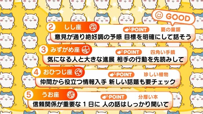 『めざましテレビ』で放送中の「ちいかわ占い」 テレビ放送がない日はお休みで、月~土:朝7時以降に更新予定です。