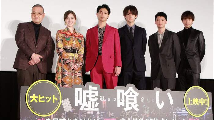 横浜流星さんが主演を務める映画「嘘喰い」の公開記念舞台挨拶が2月12日に行われ、横浜さん、佐野勇斗さん、白石麻衣さん、櫻井海音さん、三浦翔平さん、中田秀夫監督が登壇しました。