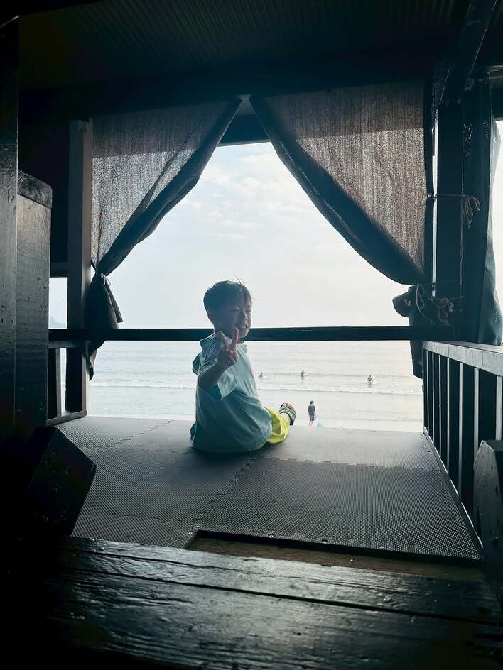 魔裟斗さんが撮影したと思われる写真には、こちらに振り返り、笑顔でピースを決める息子さんの姿が。海の家のような場所に座る息子さんの髪は、風で なびいて涼しそうです。