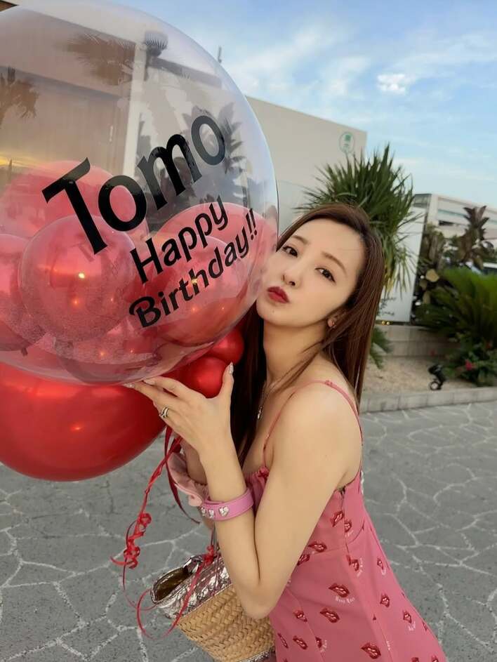 青空の下で、「Tomo Happy Birthday!!」と書かれた透明なバルーンと真赤なバルーンを手に持ち、たたずむ板野さん。胸元が大きく開いたビビットピンクのキャミソールワンピースに、かごバッグを合わせた夏らしさ全開のコーディネートです。