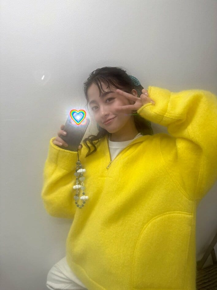 公開された写真には、ビビットな黄色のフリースを着てピースをしている橋本さんが、ライトにハートが浮かび上がるフィルムを使って鏡越しに撮影した自撮りショットが!