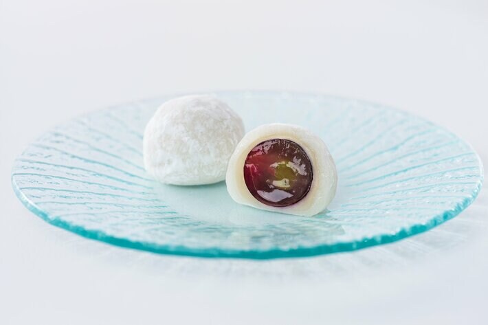 ピオーネは、糖度が高いのが特長ですが、出始めから最盛期は酸味とのバランスが絶妙。なめらかな白あんは、あんこ職人が心を込めてつくりあげる自家製ならではの味。そして柔らかいお餅。