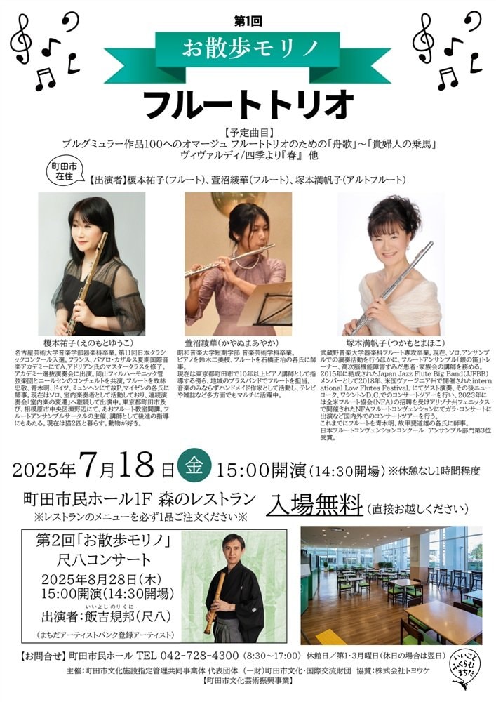 第1回目となる7月18日は、町田市在住のフルート奏者3名によるコンサートを開催します。