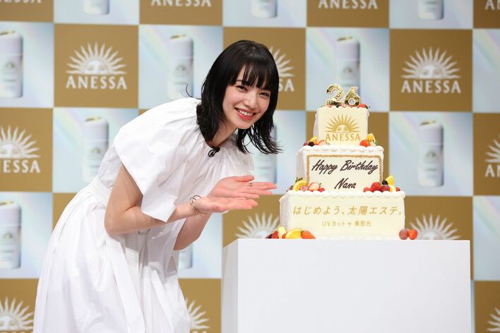 イベントの終盤には、16日に26歳の誕生日を迎える小松さんをサプライズでお祝い。ケーキが登場すると「ケーキ、大きい」と笑顔を見せ、「健康でいることはもちろんですが、プライベートで山に登るのが好きなので暖かくなってきたらまた登りたいなと思っていて。26歳かは分からないですけど、アネッサを塗りまくって富士山に登りたいです」と抱負を掲げました。