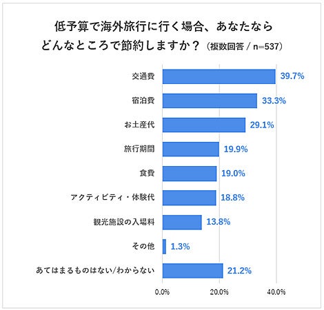 低予算で海外旅行に行く場合、どんなところを節約する人が多いのでしょうか。海外旅行先の選定にも影響していると考えられる、次の結果からご覧ください。