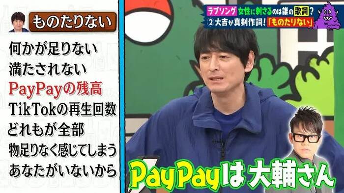 しかし、「『PayPayの残高』がいらんかったなぁ」(大悟)、「PayPayは(CMに出演する宮川)大輔さんが出てくるから」(ノブ)とダメ出しされてしまいました。