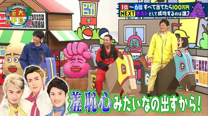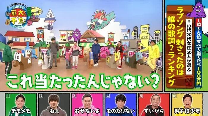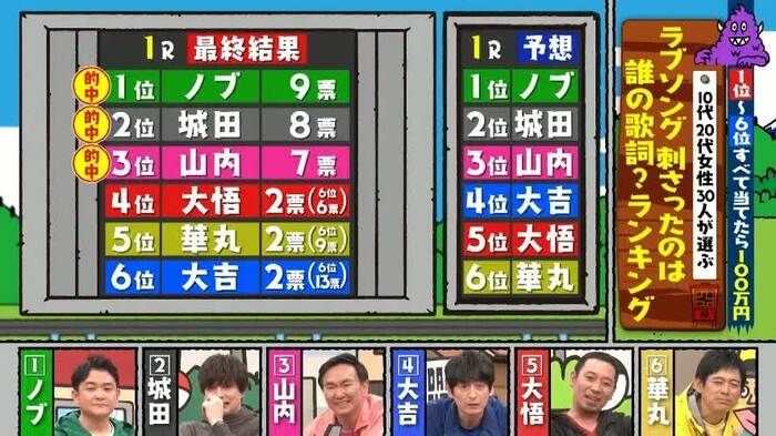 博多華丸さん、博多大吉さん、千鳥、城田さん、山内健司(かまいたち)さんの6人が、さまざまなランキングで1位~6位まで順位を予想し、すべて的中させることができれば100万円を獲得できます。