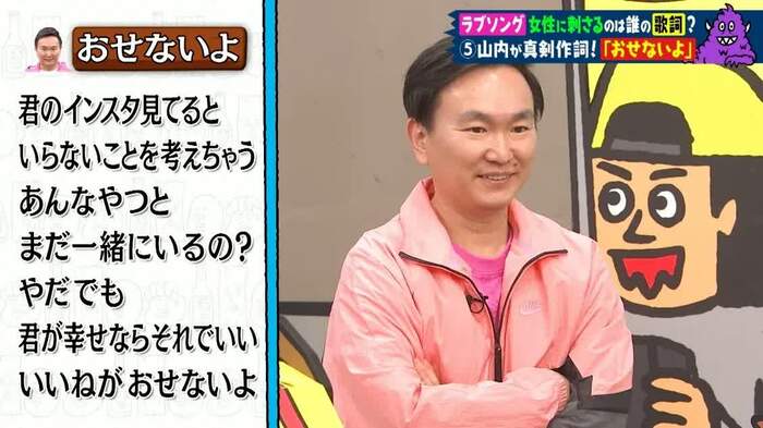 山内さんは、自分の歌詞に自信を見せましたが、華丸さんが「前の彼氏がまだ自分のインスタ見てるって、マジで気持ち悪いから」とバッサリ。