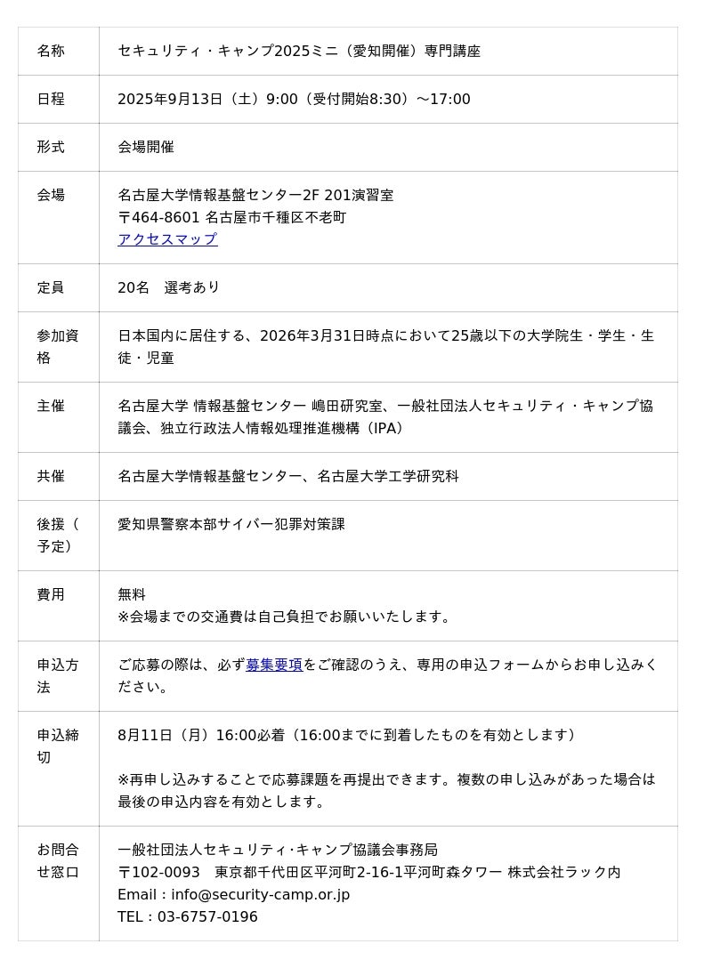 イベント詳細:https://www.security-camp.or.jp/minicamp/aichi2025.html