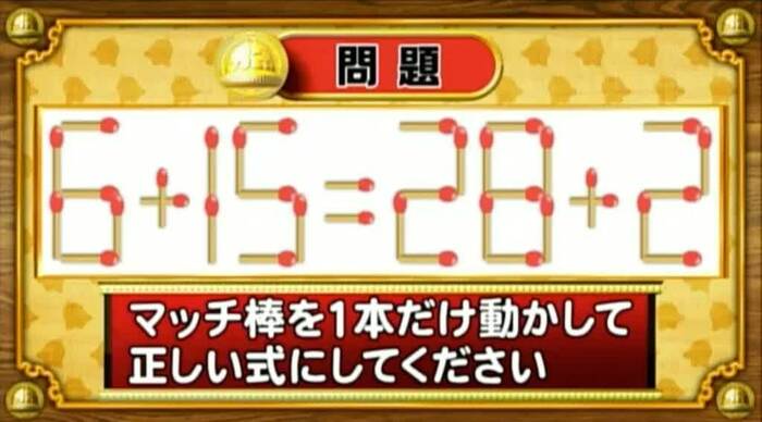 最後は、マッチ棒問題。次の式のマッチ棒を1本だけ動かして正しい式にしてください。