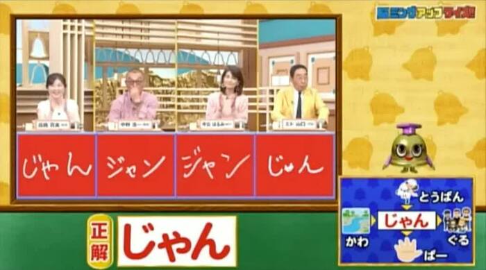 正解は「じゃん(革ジャン・豆板醤・ジャングル・ジャンパー)」。見事全員正解!