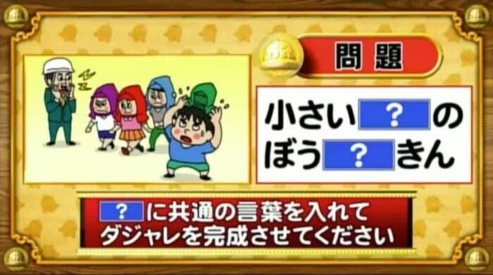最初は「脳ミングアップクイズ」から、ダジャレ穴埋めの問題。「?」に共通する言葉を入れてダジャレを完成させてください。
