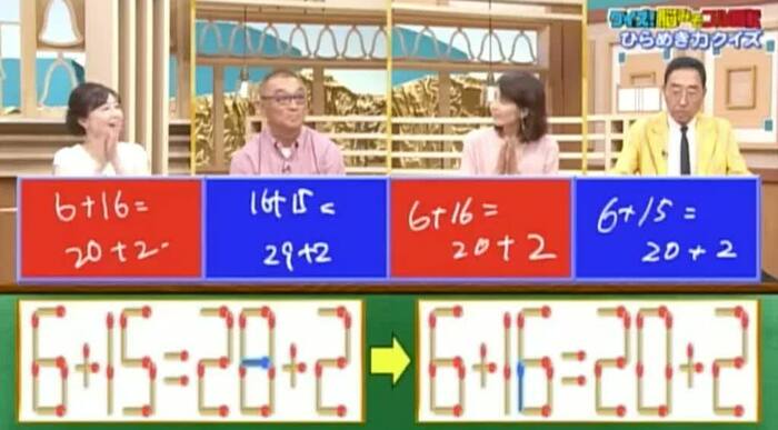 正解は、まず、右の式の「8」から1本を動かし「0」にします。その1本を左の式の「5」に足して「6」にします。そうすれば「6+16=20+2」となります。高橋さん、中島さんの2人が正解!