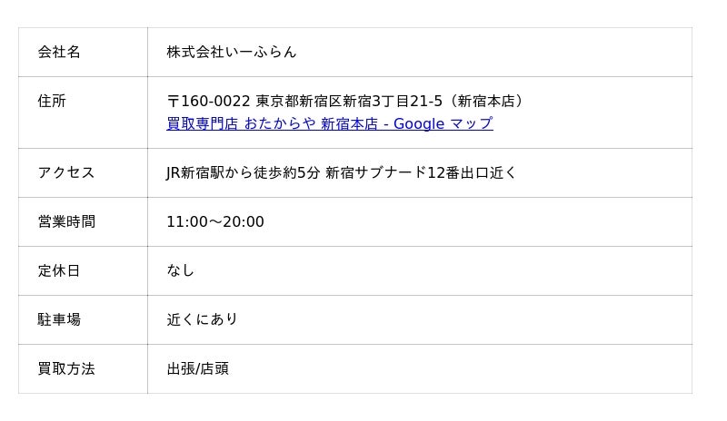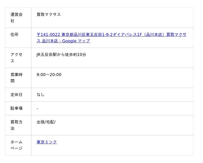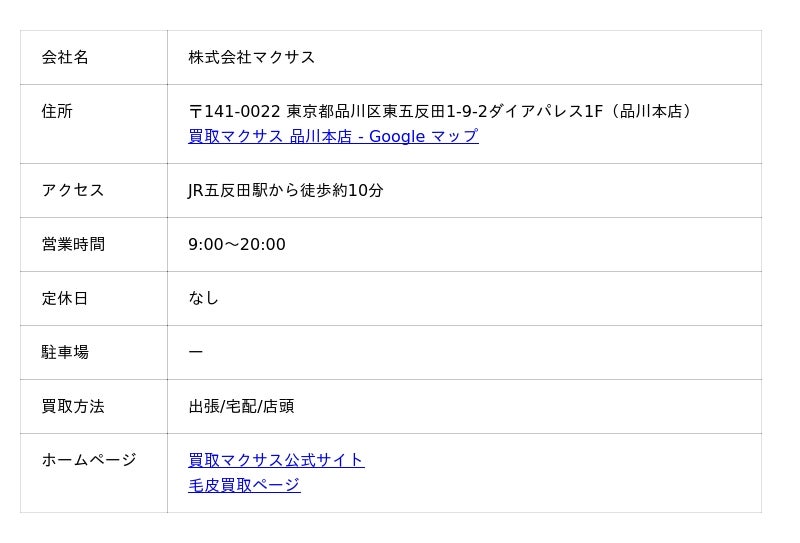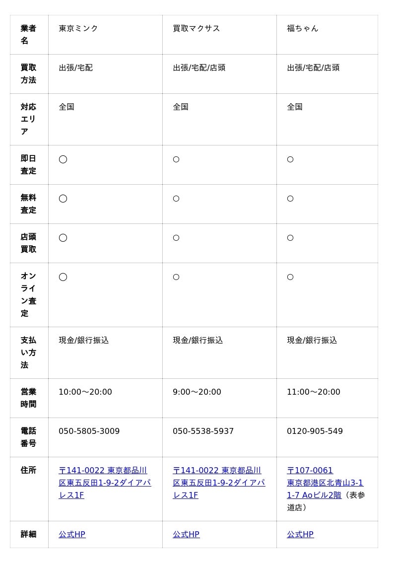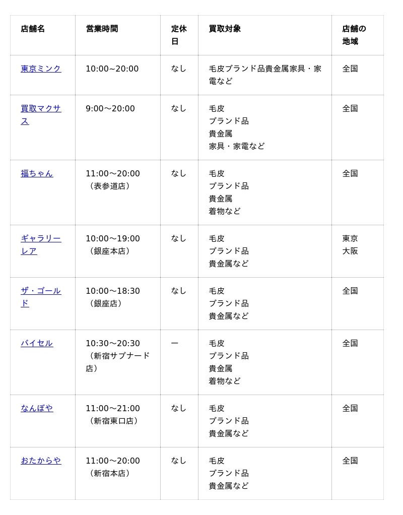 今回紹介するおすすめの毛皮買取業者、および各業者の主な情報を一覧表にまとめました。まずは、以下の表からご自身の希望に合った業者を見つけてみてください。