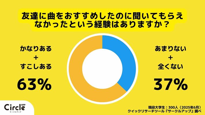 今回のアンケートでは、友人におすすめ曲を聴いてもらえなかったと答えた学生が6割、逆に「自分がすぐには聴かなかった」という学生は8割を超えました。