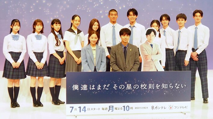 7月14日(月)にスタートするドラマ『僕たちはまだその星の校則を知らない』(カンテレ・フジテレビ系)の制作発表が7月9日に都内で行われ、主演の磯村勇斗さん、共演の堀田真由さん、生徒役を演じる11人の若手俳優が出席しました。