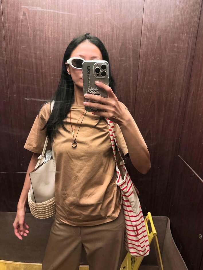 榮倉さんは、ベージュのトップスとベージュのパンツを合わせたシンプルな装いをしていて、目元にはポイントとなる白いフレームの大きなサングラスをかけています。