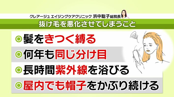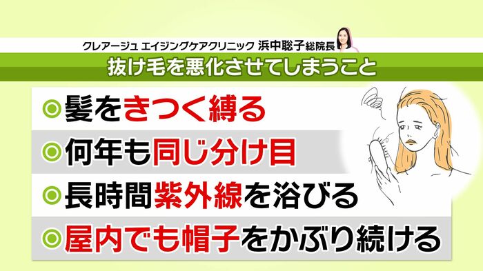 「髪を引っ張ると特に側頭部に負担がかかって抜け毛につながる」「長時間帽子を被ると頭皮が蒸れて、脂漏性湿疹などの肌トラブルにつながる」と、NG行動の理由を語った浜中先生。