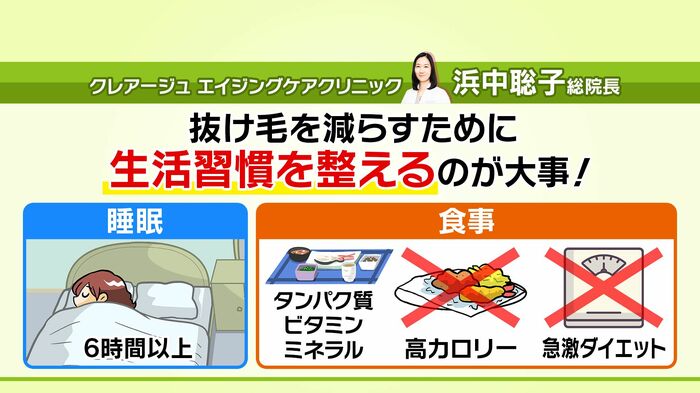 抜け毛を防ぐには、6時間以上睡眠を取り、タンパク質やミネラル、ビタミンなどをしっかり摂って高カロリーな食事を控えるなど、生活習慣を整えることも大切だといいます。