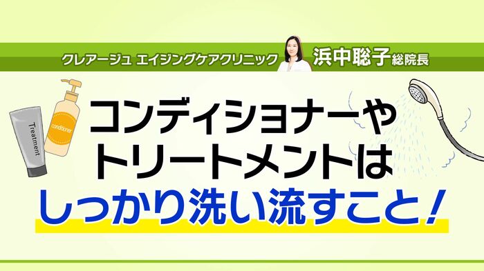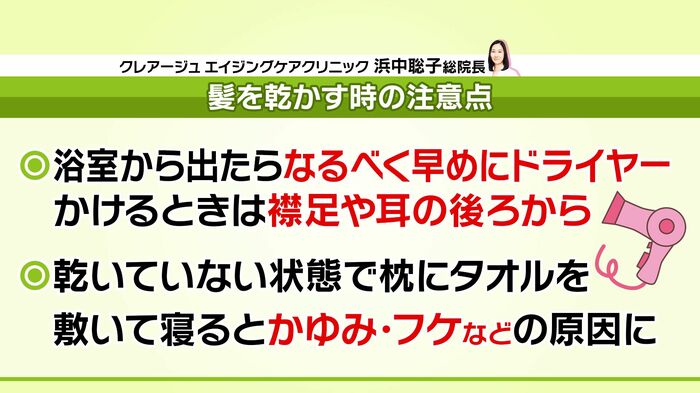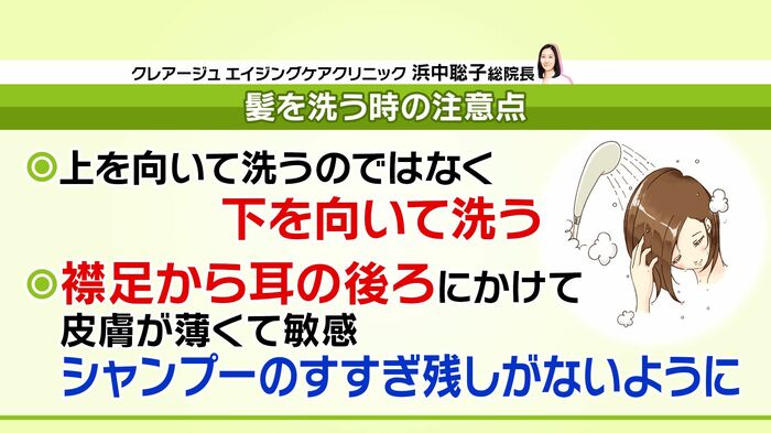 浜中先生は髪の毛の正しい洗い方と、乾かし方についても解説しました。髪の毛を洗う時は「下を向いて」「皮膚が薄い襟足から耳の後ろをしっかりすすぐ」のがポイントだといいます。