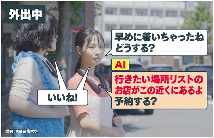 シャープが京都芸術大学と共同開発中の「AIスマートリンク」では、例えば友達と出かけた際、「早めに着いちゃったね、どうする?」と会話をすると、AIが「行きたい場所リストのお店がこの近くにあるよ。予約する?」とAIの方から提案をしてくれる時代になると。