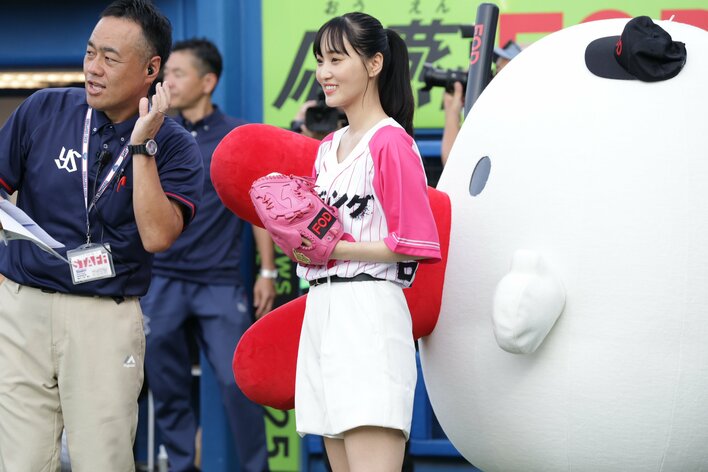 このカードは「応燕はFODで!ナイター」と題して開催され、カンテレ×FODドラマ『ロンダリング』に出演中の菅井さんは、カンテレのロゴと同じピンクのグローブ、さらに背番号「8」のオリジナルユニホームに、白のミニ丈のパンツをあわせた出で立ちで、バッターボックスに立つカンテレのステーションキャラクター『ハチエモン』と一緒に登場!