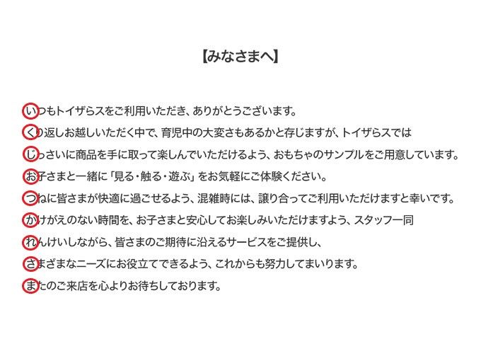 「実際におもちゃを手に取って楽しんでいただきたい」「お子様におもちゃを見て、触って、遊ぶ楽しさを体験してもらいたい」「お子様とのかけがえのない時間を当社店舗でお楽しみいただきたい」というのは当社が以前より発信してきたことであり、今回、改めて伝えさせていただきました。