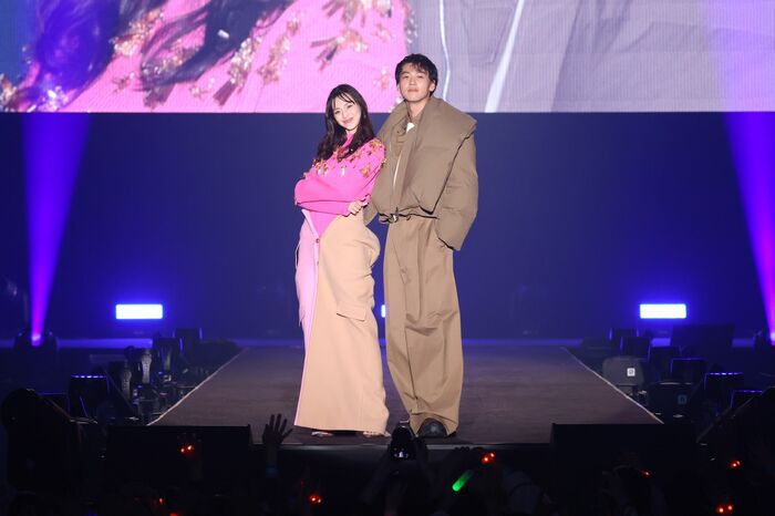 冒頭のクールな印象とはうって変わって、ピンクの衣装に身を包み、弾けるような笑顔でランウェイに登場した中条さん。その後ろからボリューミーなアウターを身にまとった竹内さんが登場すると、会場はさらにヒートアップ。