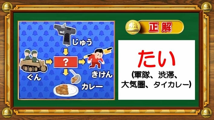 「ぐん[?]」「じゅう[?]」「[?]きけん」「[?]カレー」。4つのイラストに共通してくっつくワードは何でしょうか?
